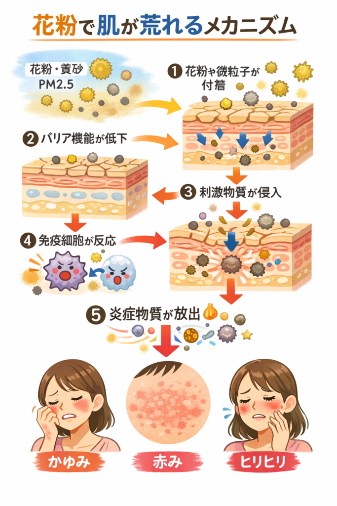 科学的には、健康な角質層は外部刺激の侵入を大きく防ぎます。しかし乾燥や洗いすぎ、摩擦などでバリアが弱まると、花粉そのものや付着した刺激物質に反応しやすくなります。これが「花粉の時期だけ肌が荒れる」大きな理由です。